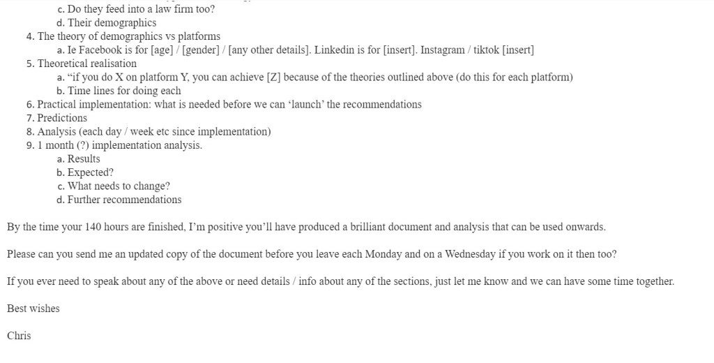 Before I was even offered the internship at littlebitoflaw, I was given the Terms of Reference document which you can see above. This document was put in place so that before even having the interview I knew the types of content the client was looking for, based upon the Terms of reference I drew up a brief marking plan which I took to my interviews to give the client a taster of what I had to offer, this would extremely well as he loved my plan/ideas and offered me the job on the spot. From there I went drew up an official plan with more detail which I took to my internship on my first day, where the client Chris and I sat down and went through making sure everything he wanted was included and if he wanted any other changes on the 6th February 2023 the official marketing plan structure was approved for me to start working on.
