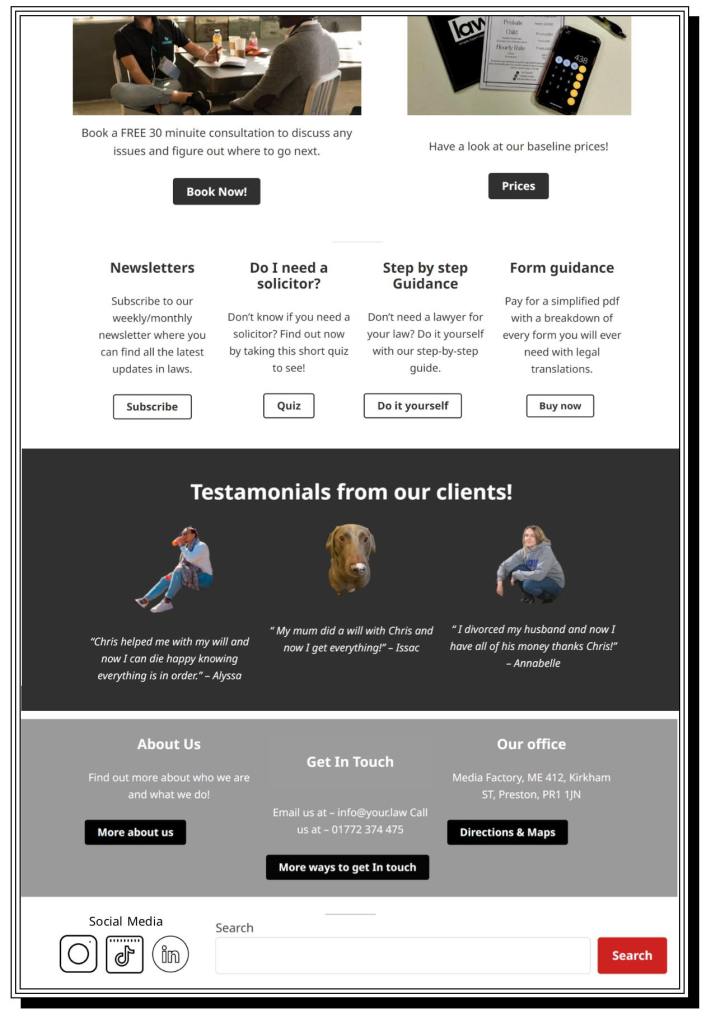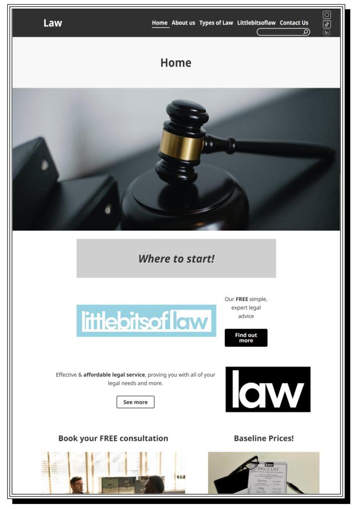 Now on the 20th of March 2023, the client, Annabelle (another intern) and I sat down with the client and went through the new ideas which we had come up with to get his opinion. during this process the client then decided that he wanted to bring together his two companies littlebitsoflaw and Law, which I had suggested in April 2023 but said no and rather than focus on their social media as stated in the Terms of reference, he then decided that he wanted me to move off of social media and work on creating him a new website template incorporating both business and the new ideas which were suggested. It was here where I then spoke to the client to inform them that it would not be possible for me to completely design a new website template for him in the last remaining weeks on my internship, but what I could do is make a template homepage so he could see what it would look like, so from here I finished the social media marketing report as well as a template website.